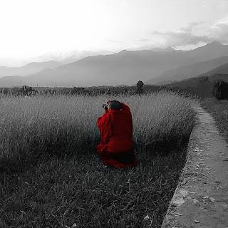 The sun was beginning to wane. The clouds darkened overhead. A cheerful old monk was doing his circumambulations (Parikrama). A couple of teenage monks played football inside while a younger monk saw us and shyly hid behind his senior. We just sat silently and watched... like the giant chortens. And as we watched we noticed a lot of little things...Each chorten, though looked similar at first glance, had a unique design. There were 3 dogs in the monastery, 2 brown, 1 black. And I was undeniably envious of the monks and their peaceful smiles...What did they have that I didn't? But as I sat a while longer and a shred of their peace sank in me... I realized maybe it's not about what they have...but about what they don't.